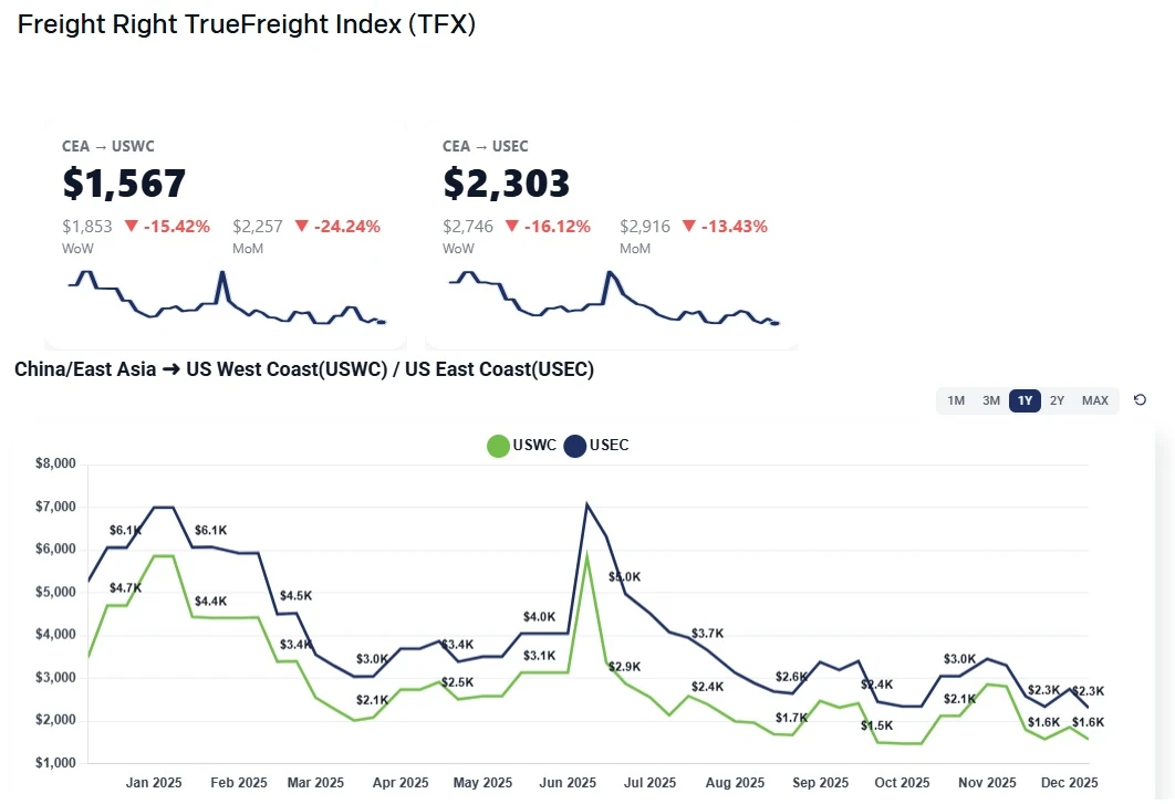 Transpacific ocean freight rates dropped sharply this week as weak import demand and the Thanksgiving holiday slowdown pushed China–US West and East Coast spot prices to new lows. Get the latest market drivers and outlook.