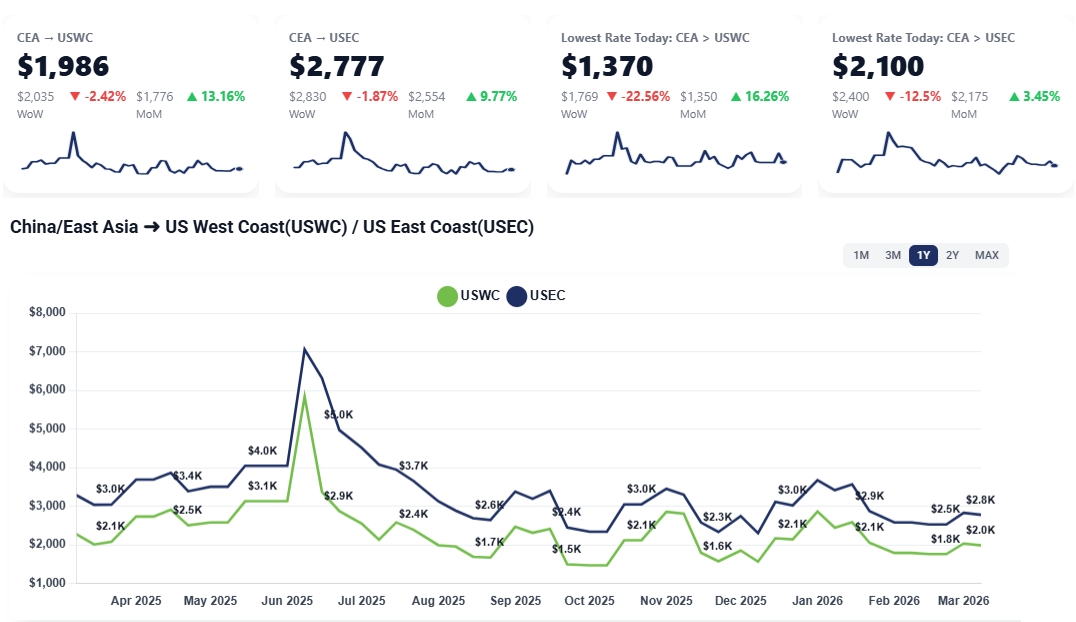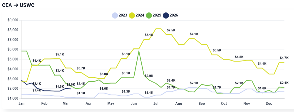 CEA to USWC: Rates have held relatively steady week-over-week, currently sitting at approximately $1,500 per container. Carriers are resisting further drops, as current levels offer little to no profit margin.