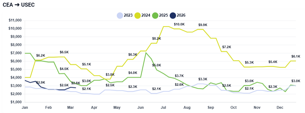 CEA to USEC: Rates to the East Coast continue to hover around the $2,400 to $2,500 mark. The spread between West and East Coast pricing remains consistent with the previous two weeks of market activity.