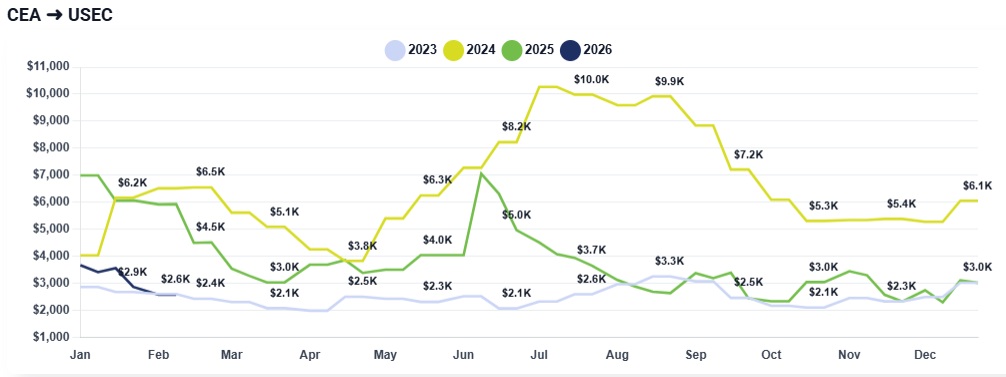 CEA to USEC: Rates to the East Coast also show no week-over-week change, maintaining a range of $2,400 to $2,500.