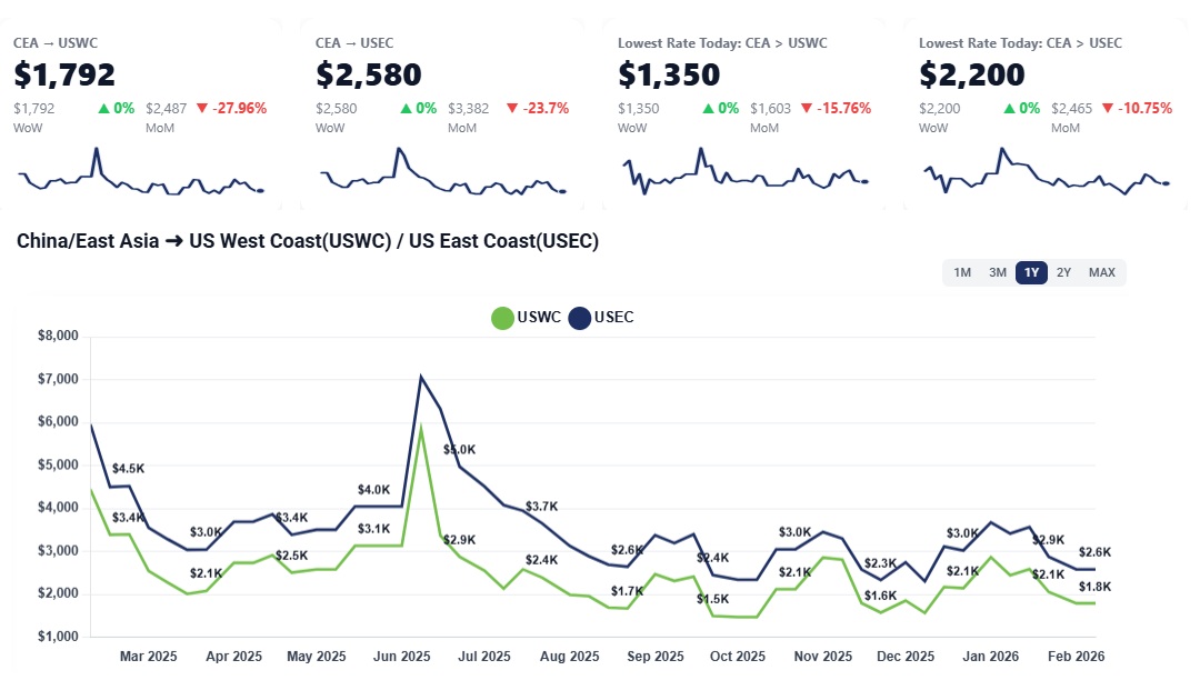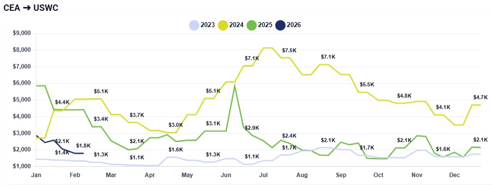 CEA to USWC: Rates remain steady and are currently holding between $1,400 and $1,600 per container. Most bookings are now quoted in the $1,450 to $1,600 range, showing total stability from the prior week.