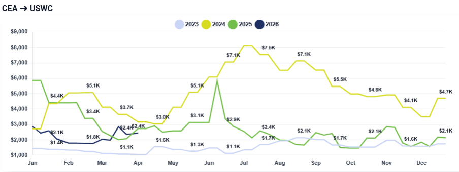 CEA to USWC: Rates have dipped slightly, now averaging between $1,800 and $1,900 per FEU.