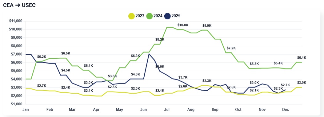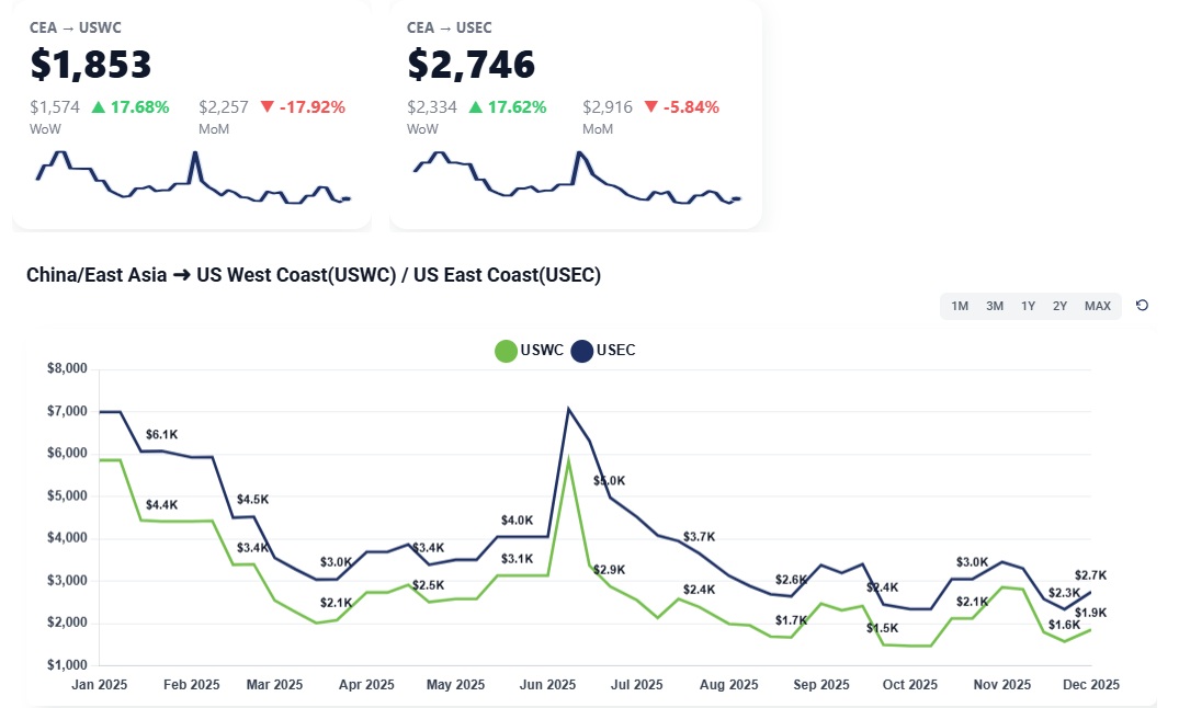 For the rest of December, CEA to USWC and CEA to USEC are expected to hover around late-November levels, with some day-to-day noise as individual carriers tweak offers. The second planned December GRI now appears unlikely to stick, given the lack of cargo and immediate pushback to this week’s increase.