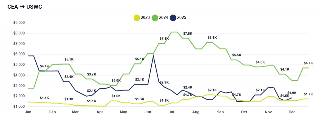 Market Still in “Test and See” Mode: Carriers are effectively throwing out different GRI numbers to see what sticks, adjusting quickly when the market pushes back. The rapid rollback of this week’s increase reinforces that buying sentiment, not filed tariffs, is setting the true market level for both USWC and USEC at the moment.