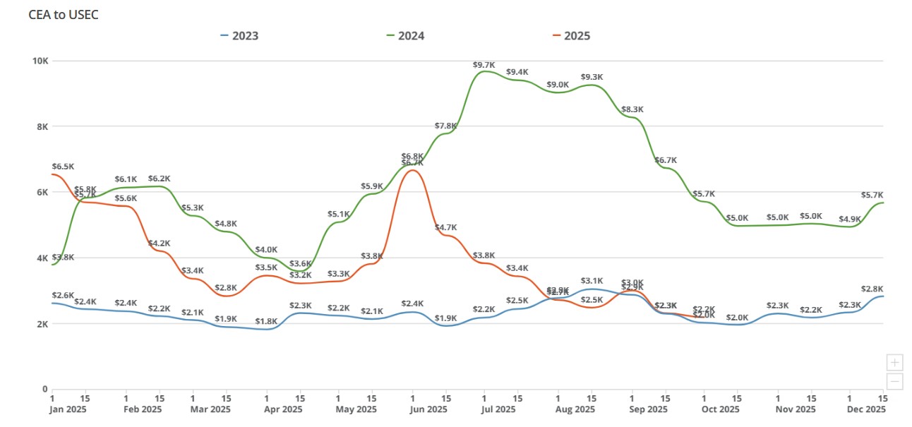 CEA to USEC (China to U.S. East Coast): Flat week-over-week. Same story as the West Coast: muted booking activity and unchanged spot levels.