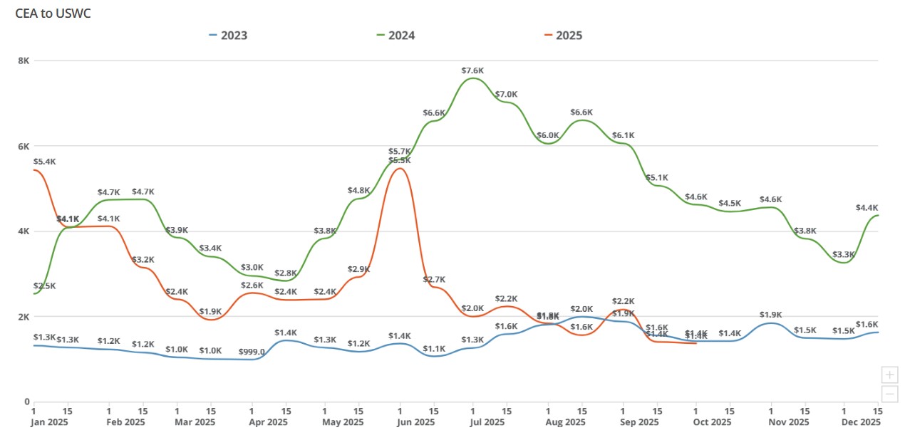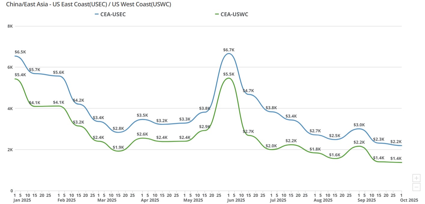 CEA to USWC (China to U.S. West Coast): Flat week-over-week. No meaningful price movement reported amid China’s Golden Week shutdown.