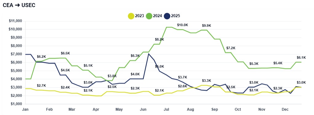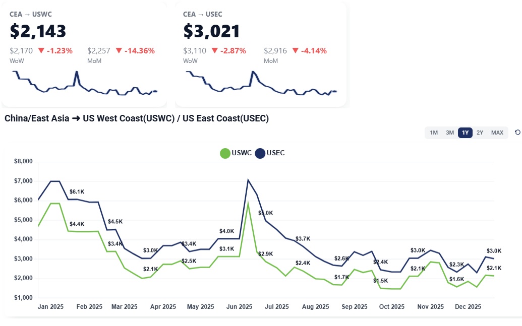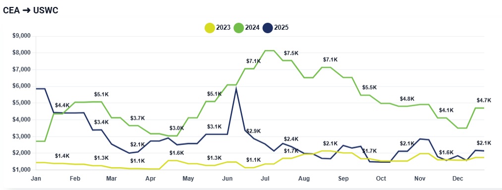 CEA to USWC (China to US West Coast): Week over week, rates were largely flat at elevated levels, holding in the $2,800–$3,000/FEU range. There was little transactional movement due to the holiday slowdown, but importantly, rates did not soften, signaling carriers’ success in defending recent increases despite weak volumes.
