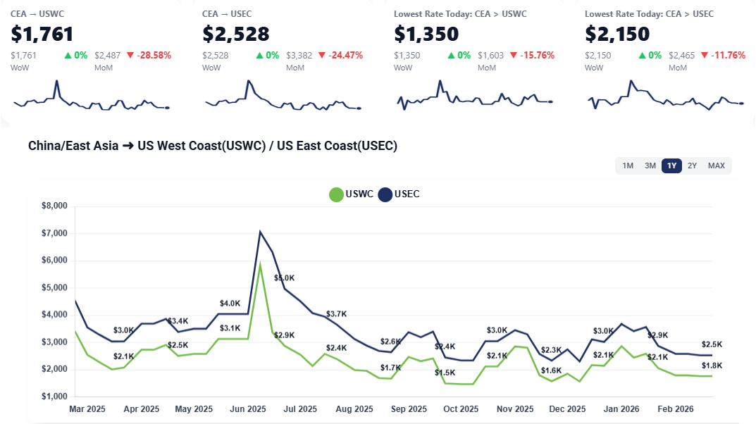 CEA to USWC: Pricing remains stable at the current floor of $1,450 to $1,600 per container. This represents a continuation of the breakeven levels seen since early February.