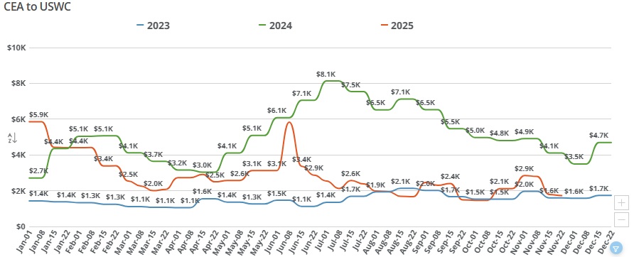 CEA to USEC: USEC rates also fell, now averaging ~$1,900/FEU, shrinking the typical spread between West and East Coast from ~$800–$900 to just $600–$700. Both lanes are effectively at or near their “rock-bottom” levels for the year.