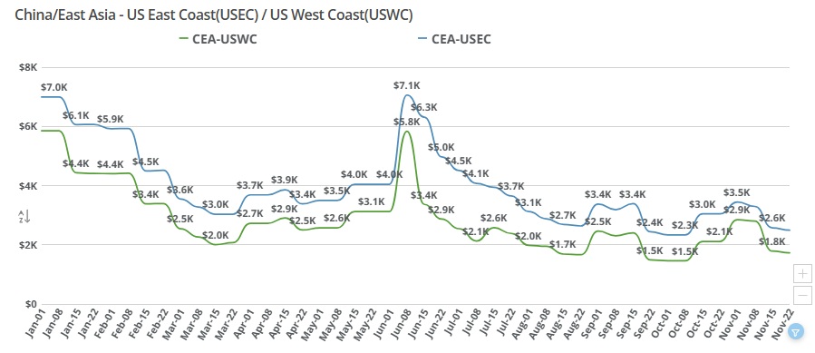 CEA to USWC: Spot rates continued their rapid decline this week, now falling to the $1,350–$1,500/FEU range, with some carrier-specific lows touching $1,350. This marks the fifth or sixth consecutive weekly drop in November, driven by slow demand and an extremely short holiday week in the US.