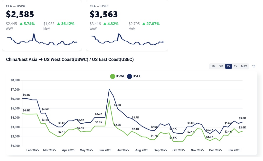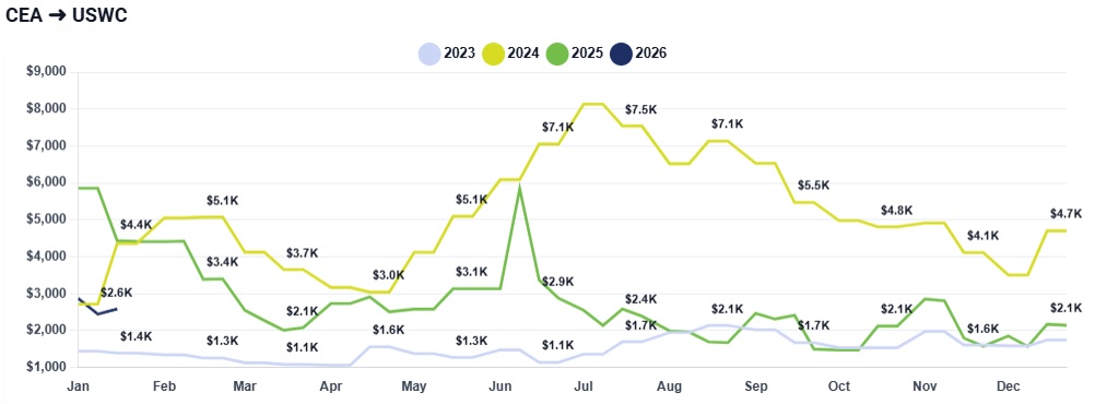 CEA to USWC: Rates have dropped significantly from previous weeks, now sitting between $1,700 and $1,800 per container. This is a sharp decline from earlier January attempts to push prices toward $3,000.
