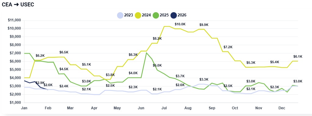 CEA to USEC: East Coast rates also dropped this week, further highlighting that the overarching trend shows rates dropping across all lanes, with carriers now operating at or near breakeven levels to maintain volume.